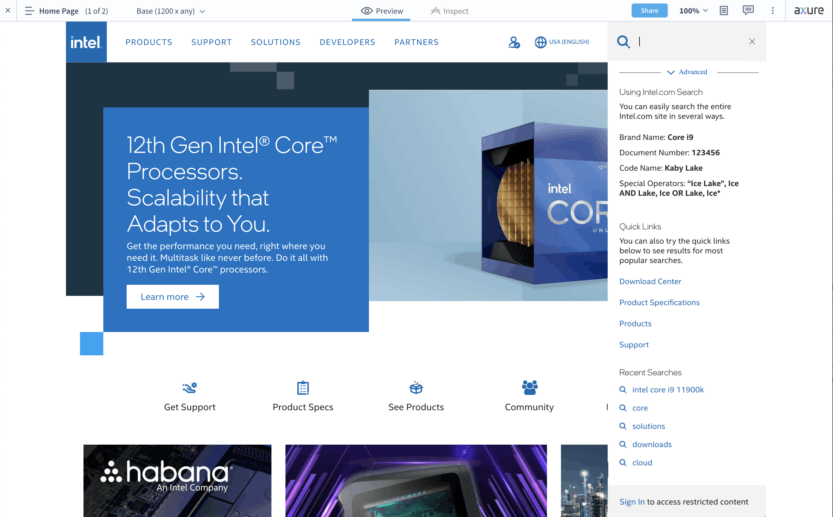 For this track of work, I led the UX and visual design with oversight from the design leads, worked directly with PMs and developers, and presented and communicated directly with client stakeholders. As part of an ongoing evolution of the Intel.com global search and strategy, I picked up work from a previous designer to continue to make improvements and updates. Our team used Axure RP for ideating and creating prototypes for user testing, and Sketch for visual design and handoff.understanding the user